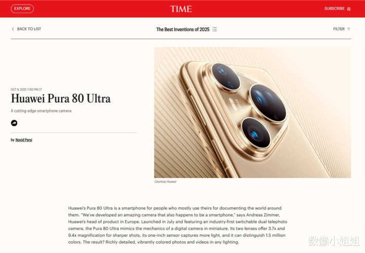 产品实力同时获得国际权威认可。在《时代周刊》2025年度最佳发明榜单中,HUAWEI Pura 80 Ultra入选消费电子类正榜,成为唯一入选的中国手机;HUAWEI Watch GT 6 Pro入选可穿戴特别提名,亦是唯一获此认可的中国智能手表产品。这标志着华为成为2025年唯一在手机与穿戴两大核心消费电子领域同时获得《TIME》认可的中国品牌,而2024年其已凭"三折叠"结构创新跻身该榜单。